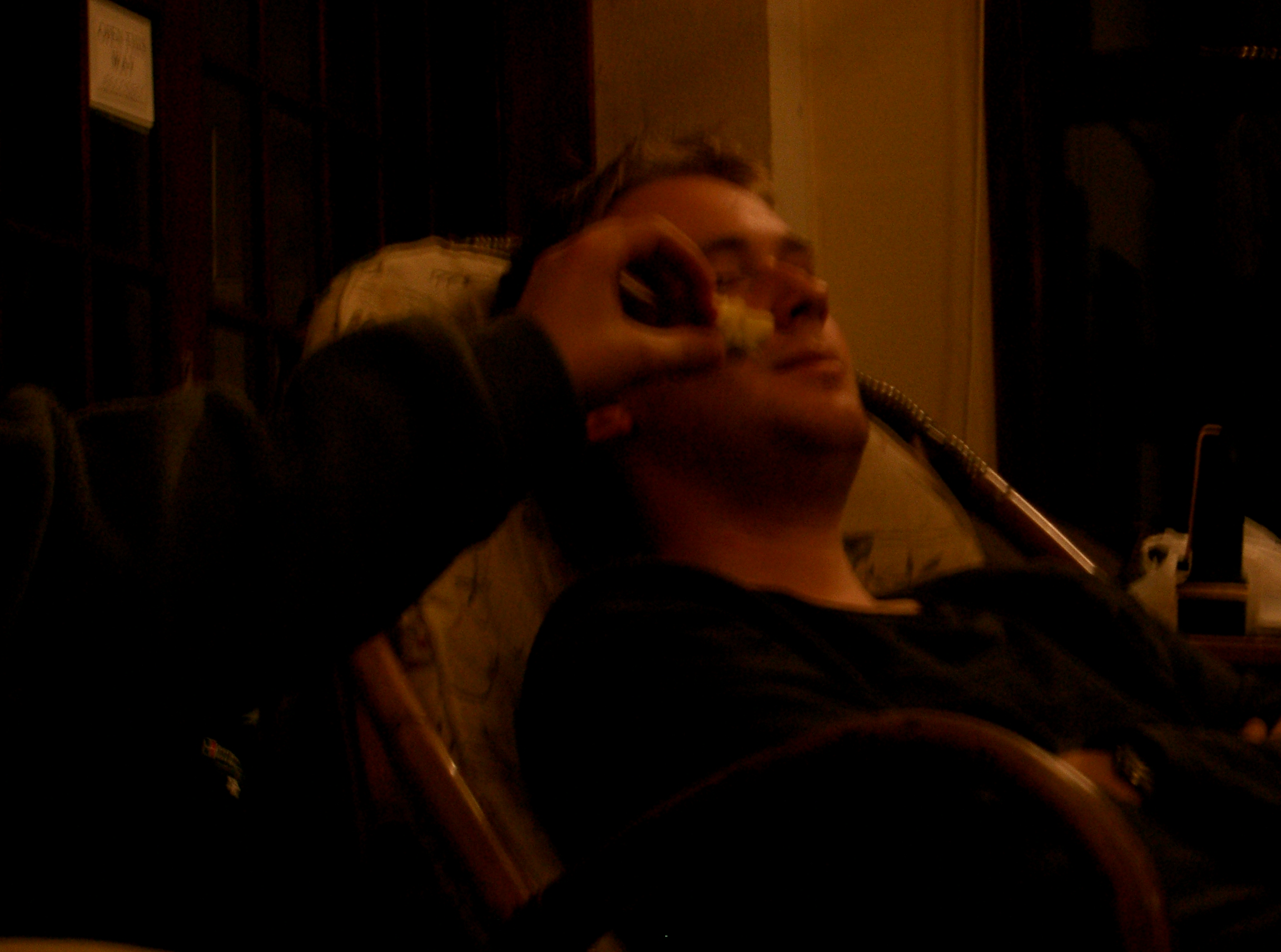 Andy tries to insert an apple core into a sleeping Tim's mouth.